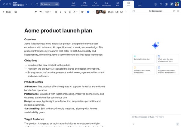 ドキュメント、メール、ミーティング要約など、ユーザーが利用可能なデータやウェブから情報を取得して、AI Companion のサイドパネル内でコンテンツのドラフトを生成することで、十分な情報を盛り込んだ初稿が作成されます。ユーザーは、自分の役割に応じてコンテンツをさらにカスタマイズすることもできます。例えば、テクニカル プロダクト マネージャーは、AI Companion に「ミーティング要約を基に、私のデザインチーム向けの製品概要のドラフトを作成してほしい」と依頼することが可能です。