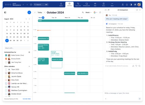 Zoom Workplace 全体にわたるデータに加え、連携させた場合は Microsoft Outlook、Gmail、Google Calendar、Microsoft Office や Google Docs からアップロードされたファイルの情報も使用して、情報のコンテキストを拡張します。AI Companion は、サイドパネル内での過去の会話や、Zoom Workplace 全体にわたるやりとりを記憶します。
