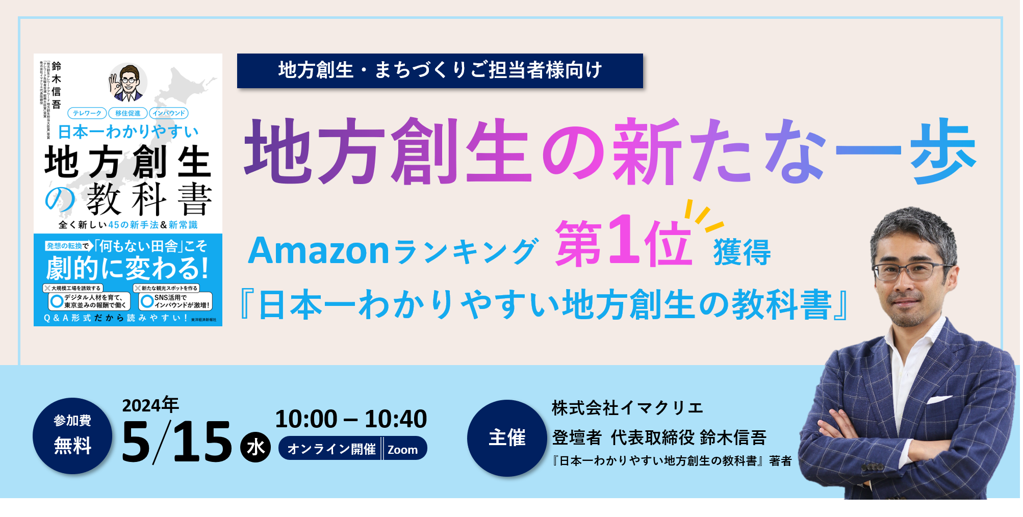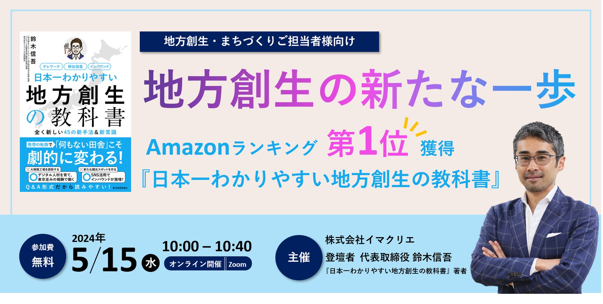 Amazon売り上げランキング第1位を獲得した『日本一わかりやすい地方創生の教科書』の著者、弊社代表 鈴木信吾が登壇!地方創生に関わるすべての人が知りたい、地方創生の最前線で起きていることを解説します