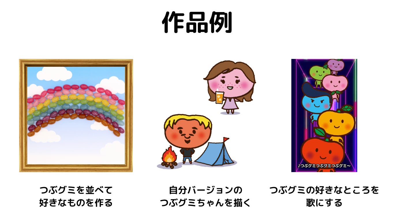 自分の好きなこと、好きなもの、好きな時間、つぶグミを使用もしくはモチーフにして自由に表現してください