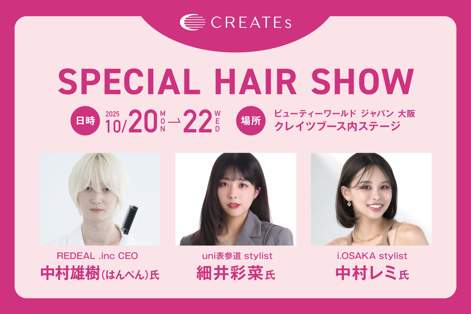 クレイツブース内ステージでは、東京・大阪を中心に活躍中の人気スタイリストによるヘアショー・ライブ配信を実施いたします。REDEAL inc. CEO 中村雄樹(はんぺん)、uni表参道 stylist 細井彩菜、i.OSAKA sylist 中村レミの3名がステージに登壇し、クレイツのヘアアイロンを使って、商品の魅力やスタイリング方法を解説いたします。
