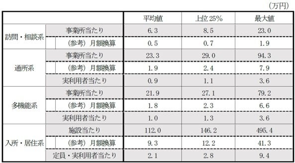 ※上掲の表のうち、事業所あたりの補助額は、令和5年度に各都道府県が実施した支援事業について、事業所あたりの平均的な支給額をまとめたものであり、参考の月額はその総額を12 で除した目安の数字。なお、補助額については、令和5年介護事業経営実態調査等の実利用者数等をもとに、厚生労働省老健局において試算したもの。また、食材料費分として明確に区分を分けて対応している補助額は、含めていない。