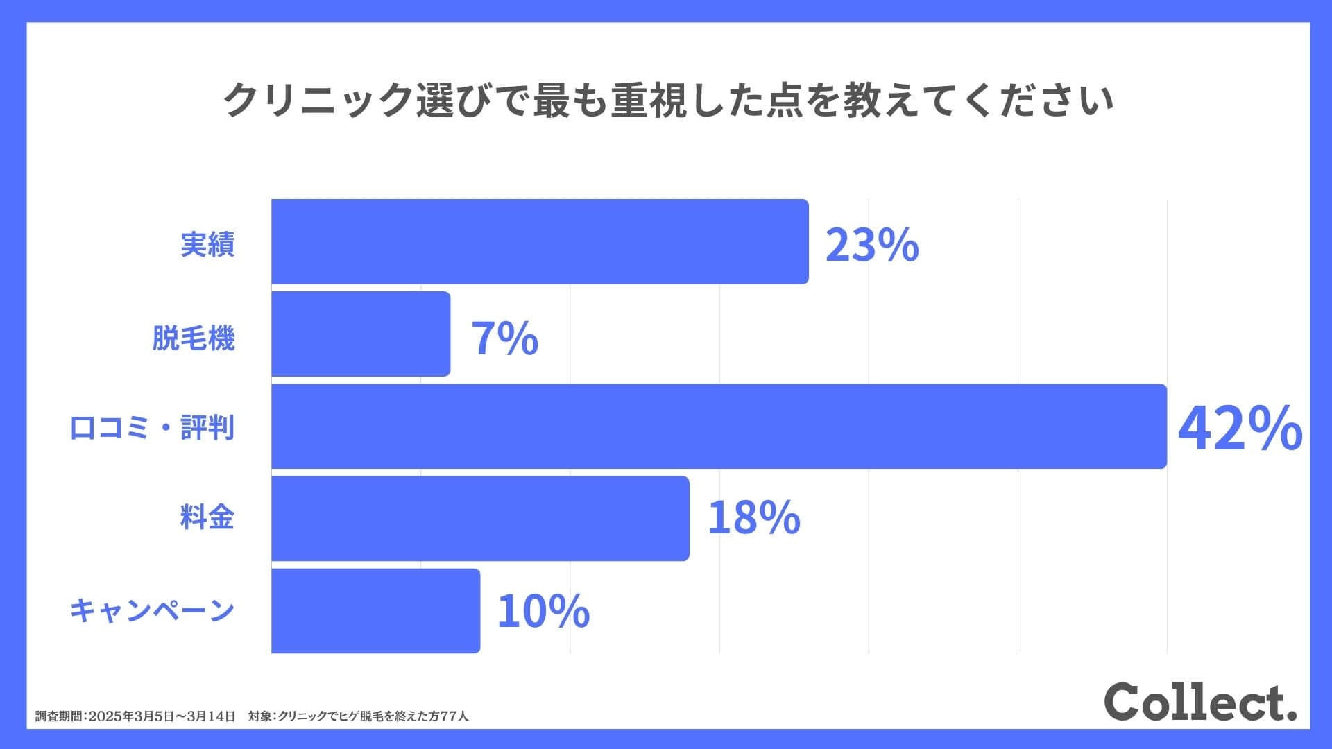 「実績」23%、「脱毛機」7%、「口コミ・評判」42%、「料金」18%、「キャンペーン」10%。