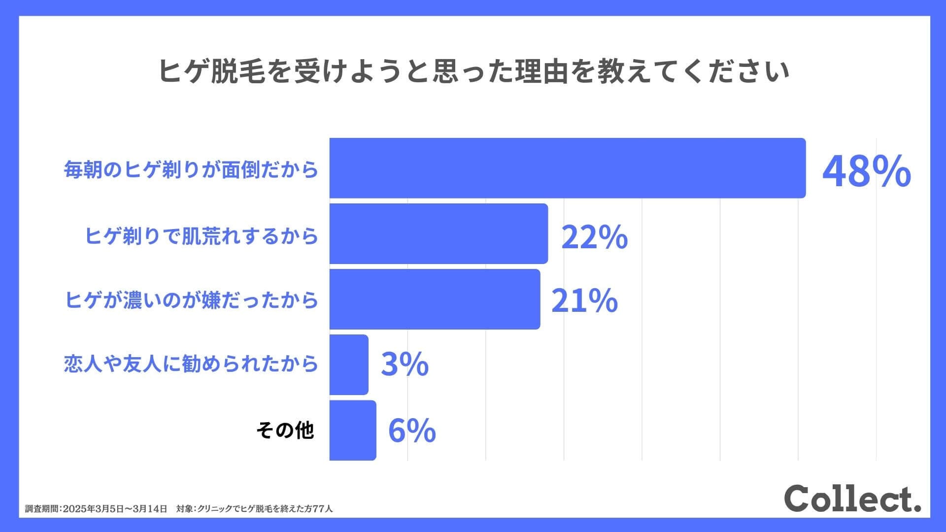 「毎朝のヒゲ剃りが面倒だから」48%、「ヒゲ剃りで肌荒れするから」22%、「ヒゲが濃いのが嫌だったから」21%、「恋人や友人に勧められたから」3%。
