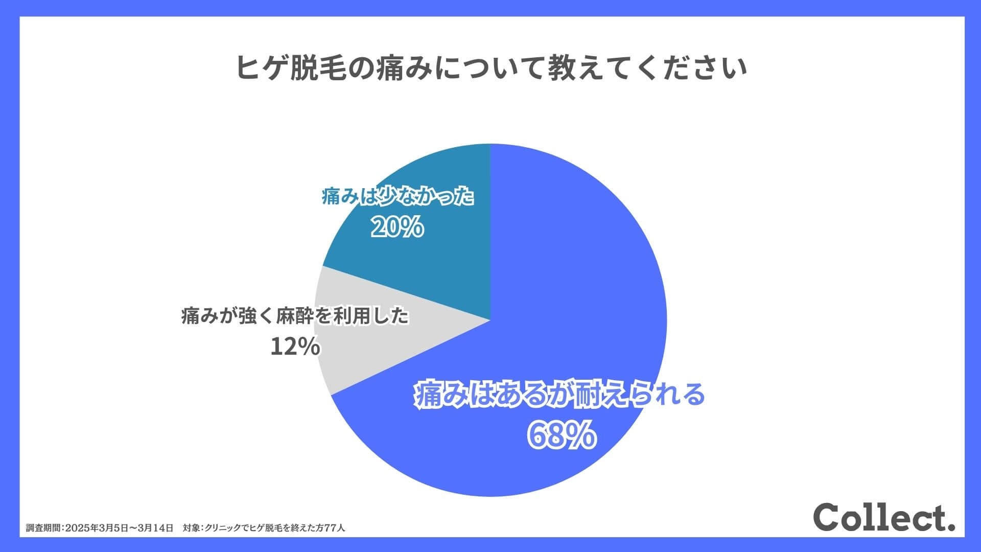 「痛みはあるが耐えられる」68%、「痛みが強く麻酔を利用した」12%、「痛みは少なかった」20%。