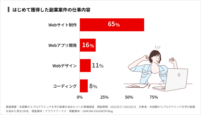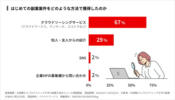 【未経験からプログラミングを学び副業を始めた人の意識調査】はじめての副業案件を67%が「クラウドソーシングサイト」で獲得