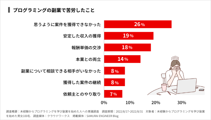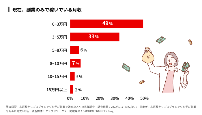 プログラミングスクール「SAMURAI ENGINEER」を運営する株式会社SAMURAI(本社所在地:東京都千代田区、代表取締役 :高比良 直人)は、未経験からプログラミングを学び副業を始めた男女100名を対象とした意識調査の結果を発表いたします。