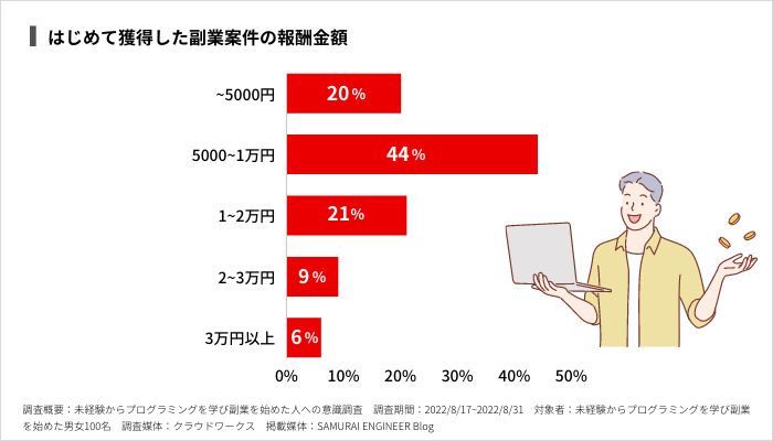 [5]はじめて獲得した副業案件の報酬金額は「5000円〜1万円」が最多の44%
