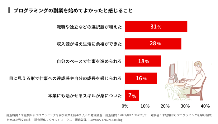 [8]プログラミングの副業を始めてよかったと感じることの1位は、「転職や独立などの選択肢が増えた」こと