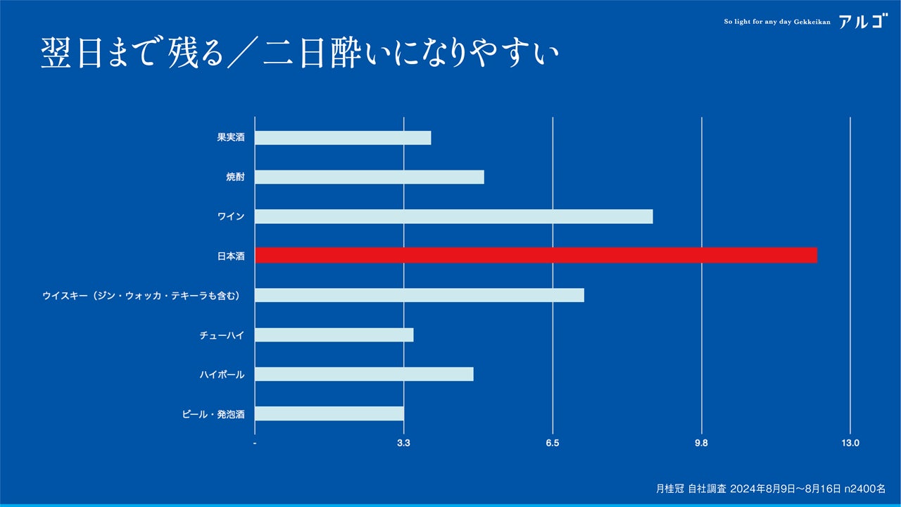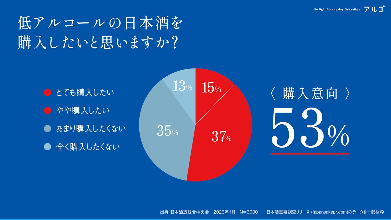 月桂冠の調査によると、他の酒類と比較して、日本酒の印象としては「翌日まで残る」「二日酔いになりやすい」という意見が多いことがわかりました。現状、日本酒がよく飲まれるのは翌日を気にしなくて良い週末など、飲酒シーンが限られています。一方で近年、低アルコール市場が拡大傾向にあり、日本酒造組合中央会の調査によると、「低アルコールの日本酒を購入したいと思いますか?」という質問に対して半数以上の53%が購入意欲を示しています。そこで月桂冠は、多様化するライフスタイルとお酒の需要に応えるべく、また週末だけでなく平日でも気軽に楽しめる日本酒を提供するため、アルコール度数5%の日本酒「アルゴ」を発売することにしました。