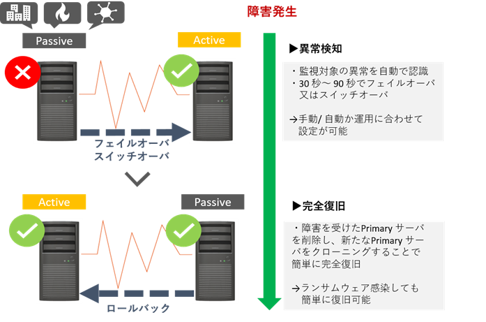 Continuity Engineは、サイバー攻撃や自然災害などによりシステム障害が生じても、ダウンタイム(システムが使用できなくなる時間)を限りなくゼロにすることで、ビジネスを安全に運用継続させるBCP・DR(災害復旧)対策の高可用性クローニング(*)ソリューションです。