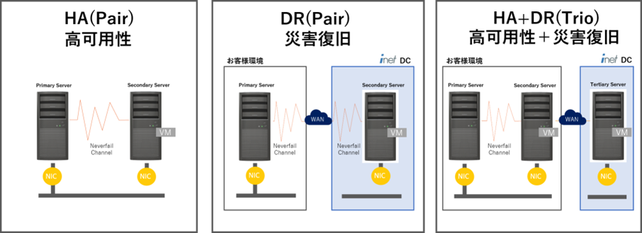 DR(災害復旧)もしくはHA+DR(高可用性+災害復旧)構成の場合、アイネットデータセンター(以下、DC)にクローンデータの保管環境を構築することが可能です。堅牢なDCで、お客様の大切なデータを保護し、障害時にもビジネスの運用継続を実現させます。