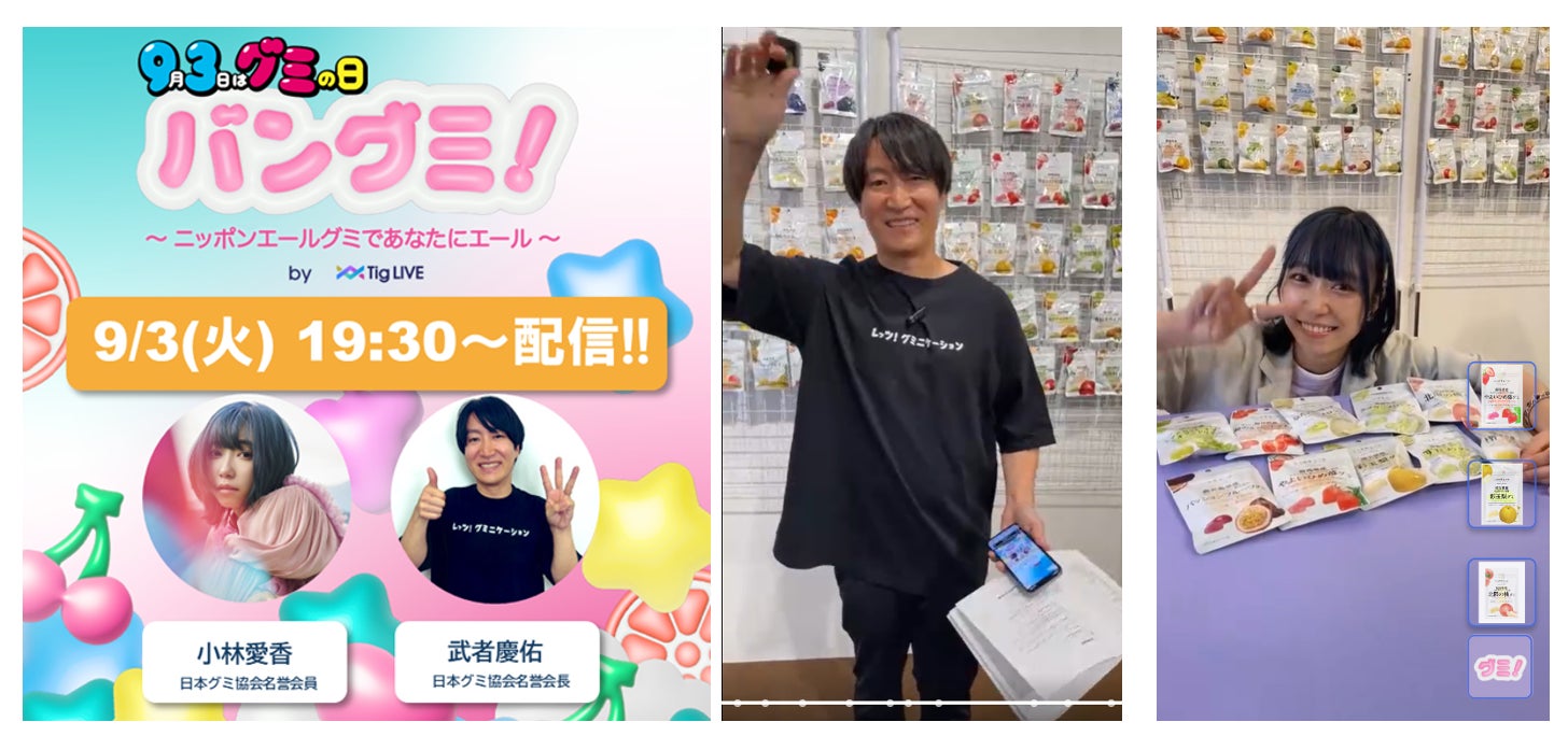 映像内のモノ・ヒト・コト・音・場所等に触れるだけで情報にアクセスできる、インタラクティブ動画技術「Tig(ティグ)」をベースとした各種映像ソリューションを提供し「Re:design communication:伝えるを再定義する」を実現するパロニム株式会社(所在地:東京都中央区、代表取締役:小林 道生、以下「当社」)は、日本グミ協会とJA全農「ニッポンエール」による【9月3日はグミの日】バングミ!〜ニッポンエールグミであなたにエール〜by Tig LIVE第2弾を、原宿の新聖地である東急プラザ原宿「ハラカド」から配信し、大盛況で終了したことをお知らせいたします。