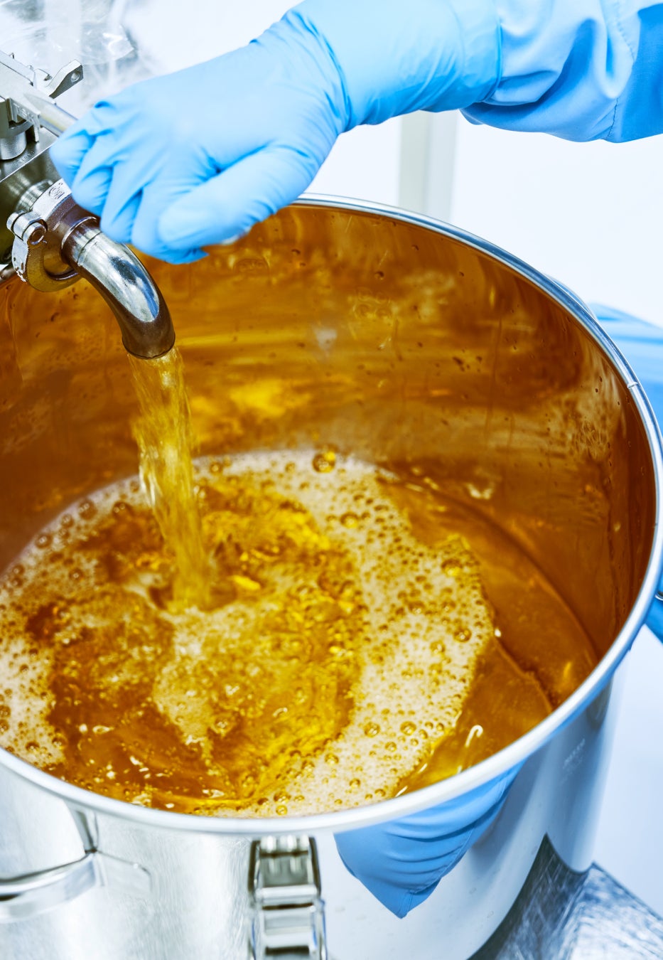 KINSではバイオジェノミクスの全面的な協力により、ヒト由来のビフィズス菌5種と乳酸菌19種を選び抜き、大豆を丸ごと使用した豆乳様培地で共棲発酵させました。複数の菌を使って発酵させる〝共棲発酵〟は、腸内や皮膚の常在菌環境と似ています。すべての菌に、できるだけ長時間生きたまま培地の栄養素を食べさせ、よりたくさんの種類の代謝産物を作らせることが重要です。それぞれの菌が互いのポテンシャルを高め合うようにコントロールしながら、長時間有益な発酵を続けさせるためには、高い技術と深い知識を必要とします。
