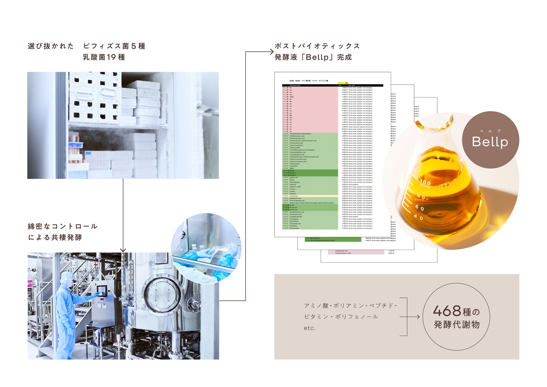 完成した発酵代謝物は、健康にも美肌にも有用な468種の物質を含んでいます。 バイオジェノミクスでは産官学連携の研究を行っており、豊富なエビデンスも取得済みです。今回は、Bellp(べルプ)の美肌作用に焦点をあててご紹介します。