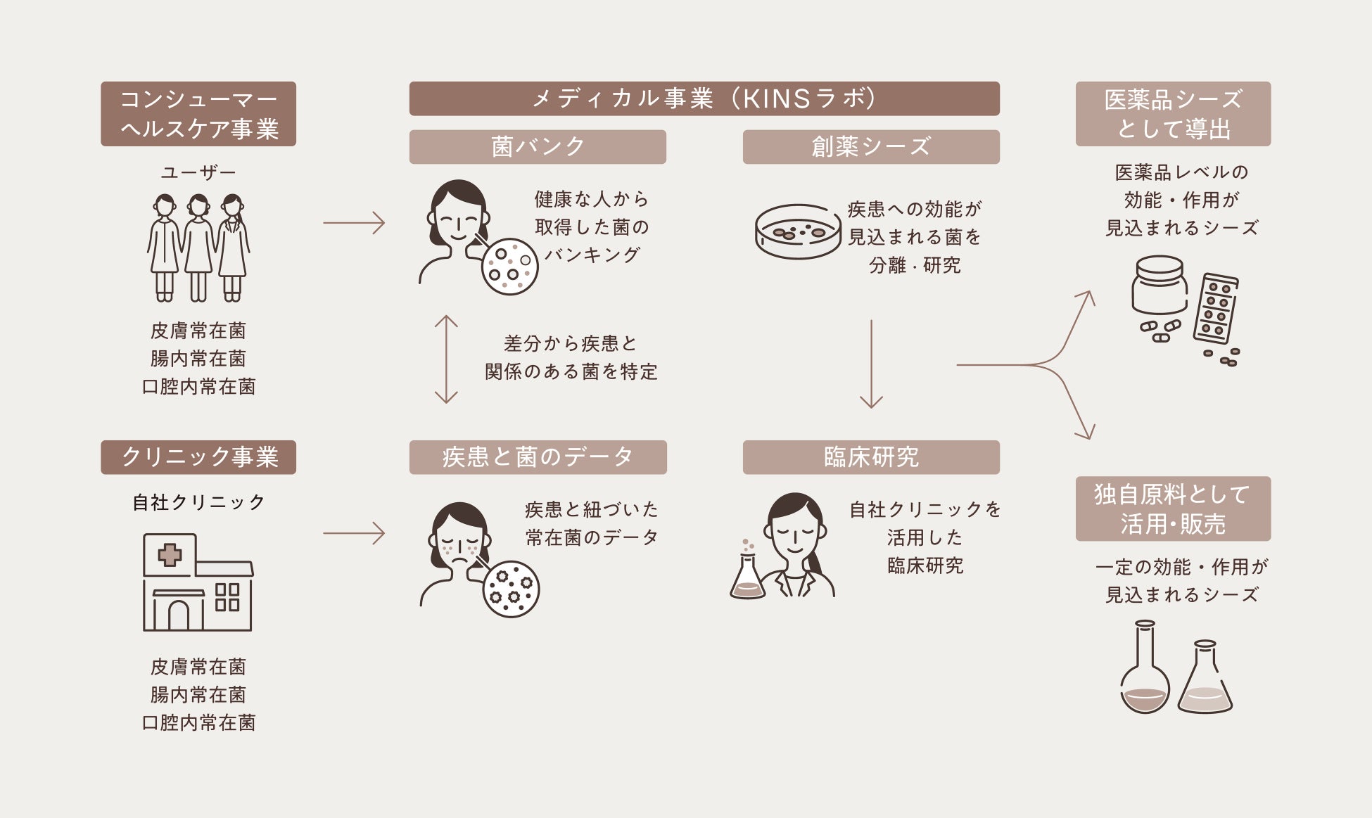 KINSは商品の販売において、お客様と直接繋がることができるDtoCという手法を選択。お客様の常在菌を取得し、菌バンクとしてデータを蓄積。それをベースに研究を重ね、有益な独自原料を開発、商品に配合する形でお客様へと還元します。