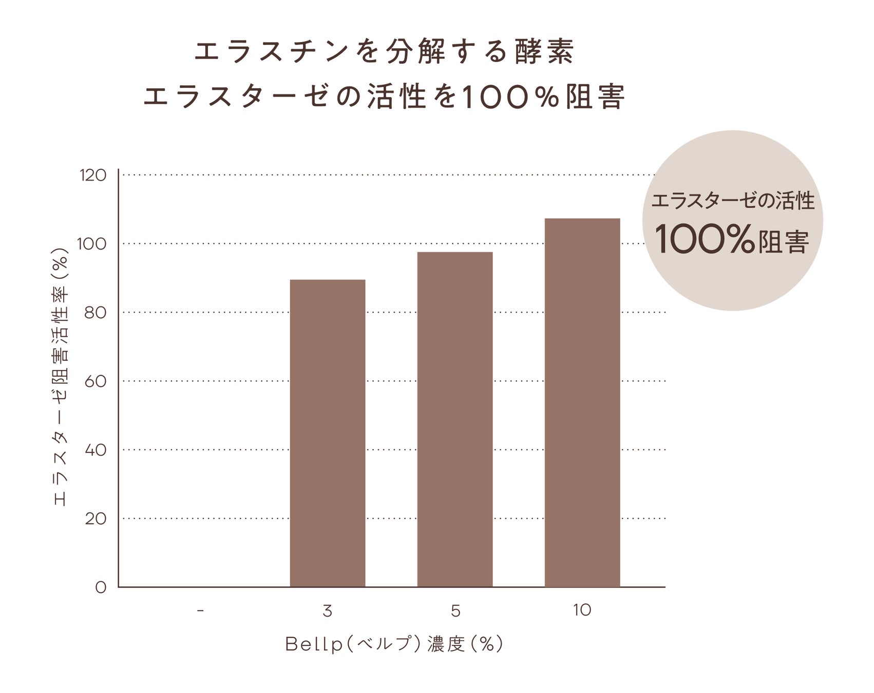 肌のハリ・弾力の低下には、真皮の線維芽細胞が生み出すエラスチンを分解する酵素・エラスターゼの活性が関与しています。「Bellp(べルプ)」のエラスターゼ阻害活性率を調べたところ、「Bellp(べルプ)」3%の溶液において87%、5%の溶液で98.3%、10%の溶液では100%のエラスターゼ活性阻害作用が確認できました。