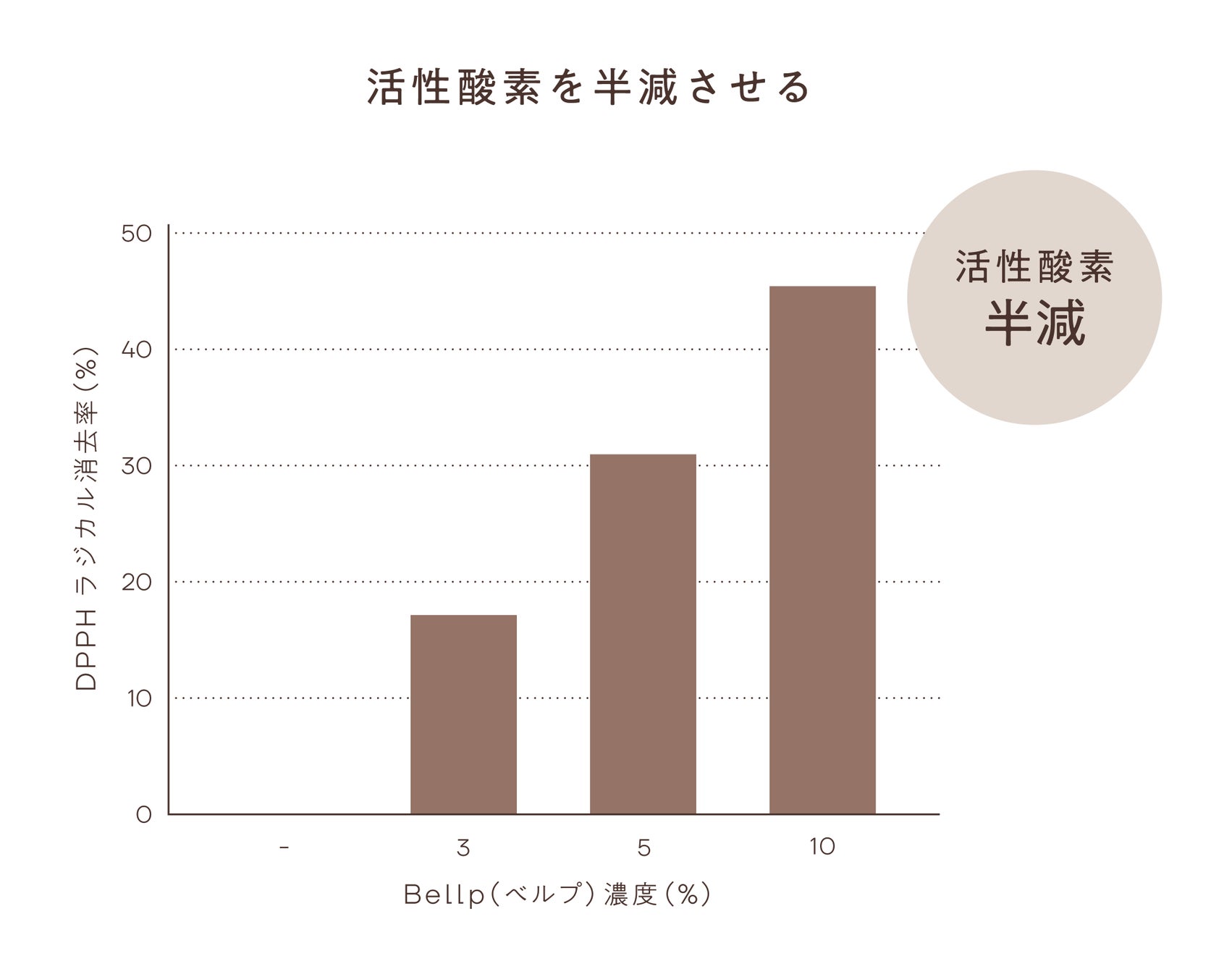 「Bellp(べルプ)」に含まれるビタミンやポリフェノールは、高い抗酸化作用 をもっています。DPPHラジカル消去という抗酸化力の高さを調べる試験を実施したところ、「Bellp(べルプ)」3%の溶液において17.3%、5%の溶液で31.6%、10%の溶液では45.6%のDPPHラジカル消去率が確認できました。