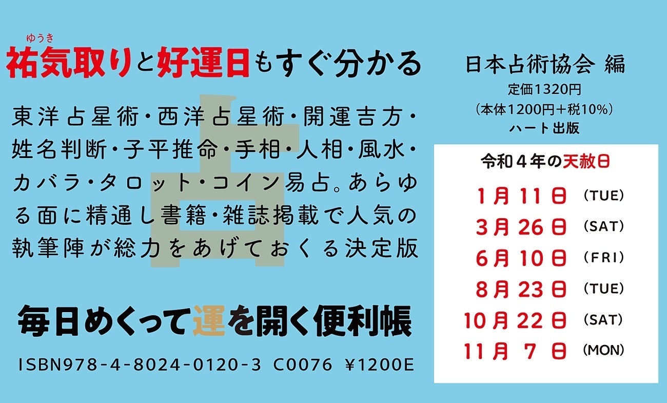 株式会社ハート出版(本社:東京都豊島区池袋 代表取締役:日高裕明)は、日本占術協会が編纂した開運暦の年度版を刊行。東洋占術・西洋占星術・開運吉方位・姓名判断・子平推命・手相・人相・風水・タロット・コイン易占など、あらゆる面に精通した人気の執筆陣が総力をあげた決定版。「占術家名鑑」付きで相談にも便利。