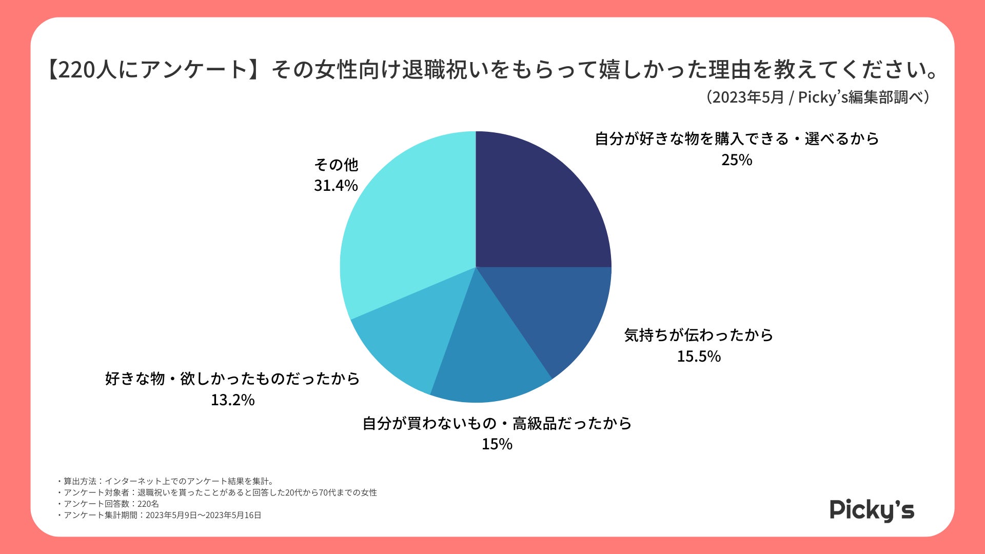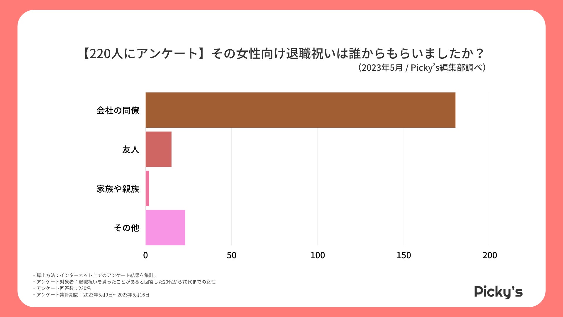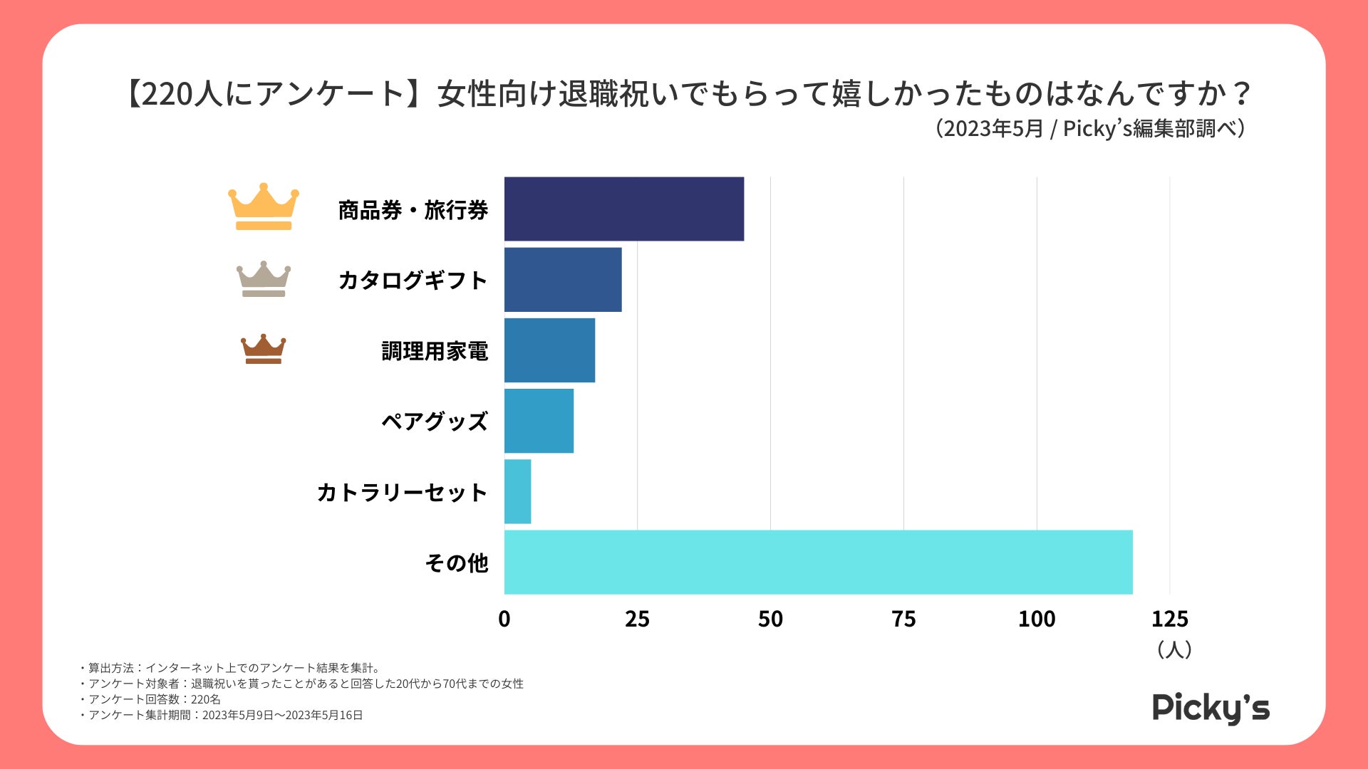 「Picky’s」は、インターネットショッピングにおいて、購入前に試せない・選ぶべきものがわからないという課題の解決を目標に、あらゆる商品のおすすめランキングや検証レビューを紹介するサイトです。このたびPicky’s(https://rentry.jp/note/)では、女性が退職祝いで貰って嬉しかったものについてインターネット上でアンケート調査を行いましたので発表いたします。