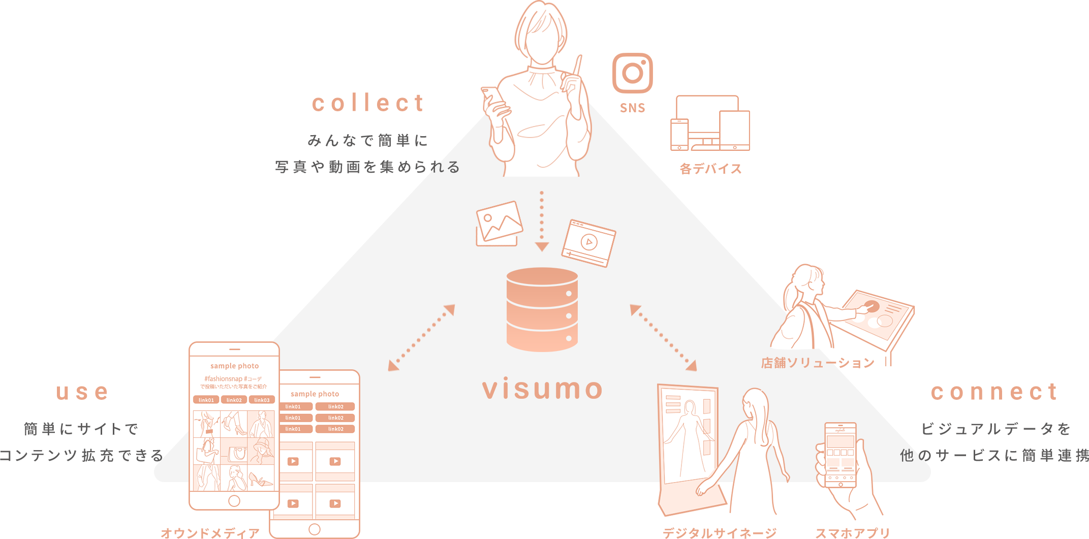 visumoはブランディングや商品訴求を強化するビジュアルデータを一元管理するビジュアルマーケティングプラットフォームです。導入実績は国内600社を超え、インスタグラム上のUGC(※)を活用する機能やYouTubeなどの動画データをオウンドメディアで活用する機能、スタッフのリソースを活用してコンテンツ投稿を強化する機能など、事業者様のウェブサイトでのデジタル接客を強化するサービスを提供しています。