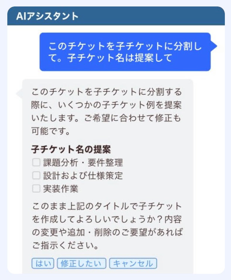 チケット内容をもとにAIが作業の完了条件を提案します。抜け漏れを防ぎ、業務の品質を⾼めます。