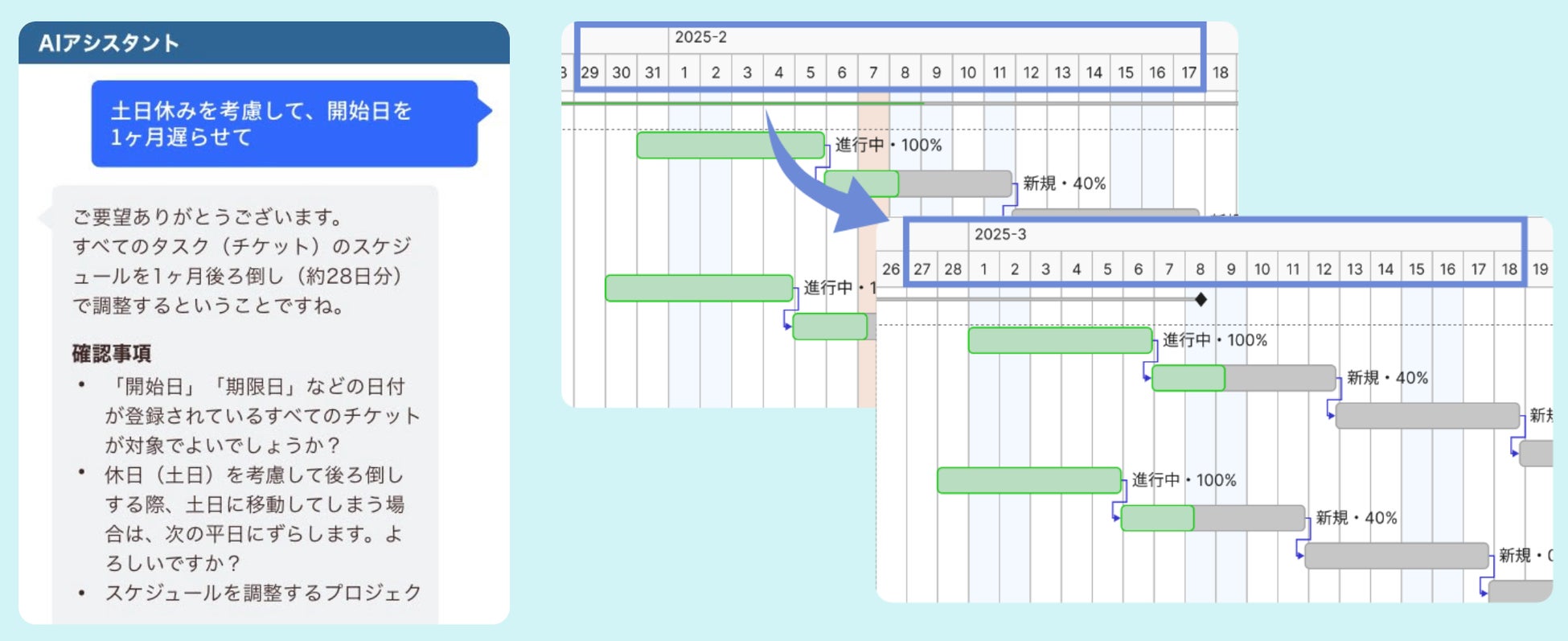ガントチャート全体のスケジュールをAIが⼀括で調整。「開始⽇を1週間延ばして」といった指⽰にも⾃然な対話で対応します。