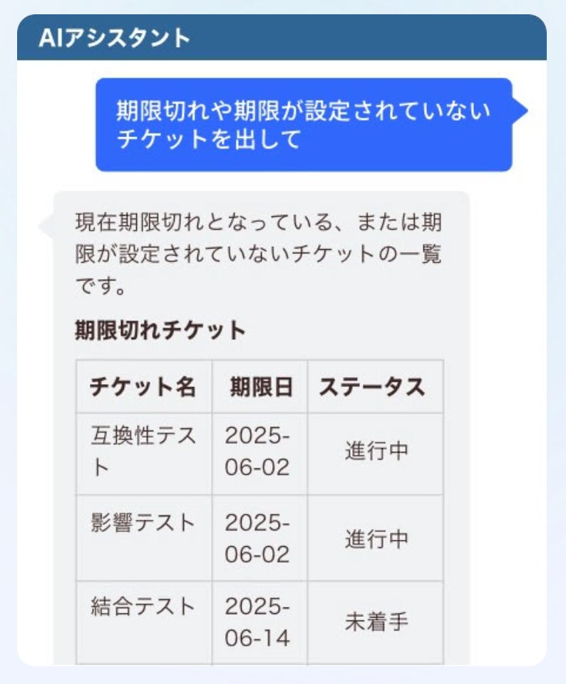 確認したい条件を伝えるだけで、必要なチケットを即座に表⽰します。「〇〇に関連するチケットを探して」「開始日が近い担当者未設定のチケットを教えて」と伝えるだけで、今まではできなかったチケットの題名、説明、コメントの横断検索や絞り込みができるようになりました。