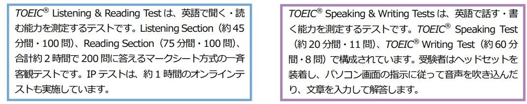 日常生活やグローバルビジネスにおける活きたコミュニケーションに必要な“英語で聞く・読む能力”を測定するテスト。テスト結果は10点から990点までのスコアで評価され、その評価の基準は常に一定に保たれる。スコアによる評価や英語能力を正確に測定できる質の高さが評価され、企業・団体においては昇進・昇格の要件として、また、社員の採用の際などに参考にされている。学校においても入試や単位認定などで広く活用されている。2021年度の日本における受験者数は約212万人。