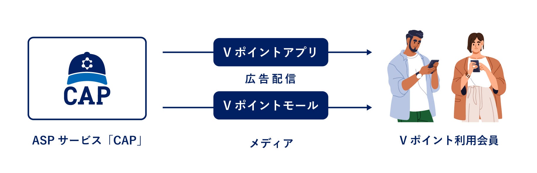 「CAP」は、CCCMKHDが展開する「Vポイントアプリ」や「Vポイントモール」などのメディアに対して成果報酬型広告を出稿できるASPサービスとして運用され、広告主はVポイントをご利用の会員に向けた広告配信が可能となります。