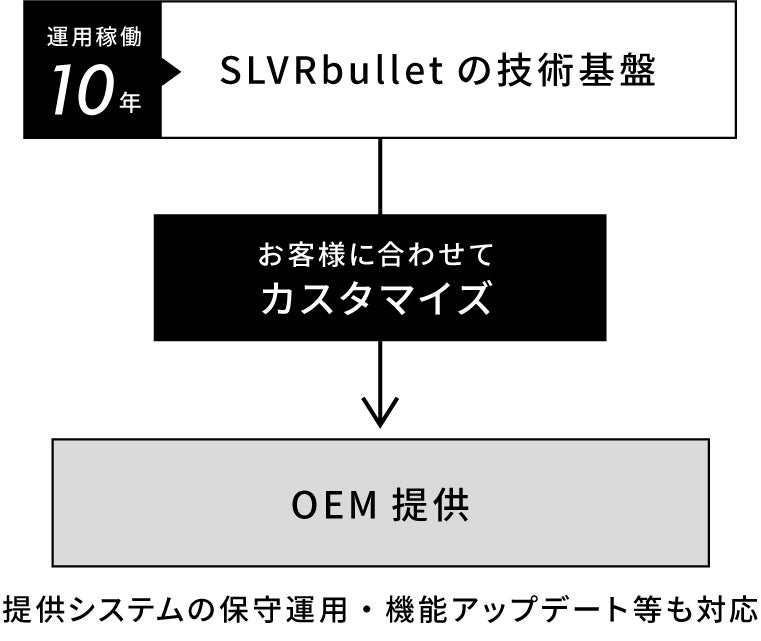バレッドグループでは、「SLVRbullet」の技術基盤を活用し、機能やシステムのパッケージ化に加え、クライアントの要望や課題、求められるスペックや運営形態に合わせて柔軟にカスタマイズ・開発したサービスのOEM提供も行っています。サービス納品後も保守運用や機能アップデート対応、効果計測環境の変化に対応するR&D成果のフィードバックを行うことが特長です。