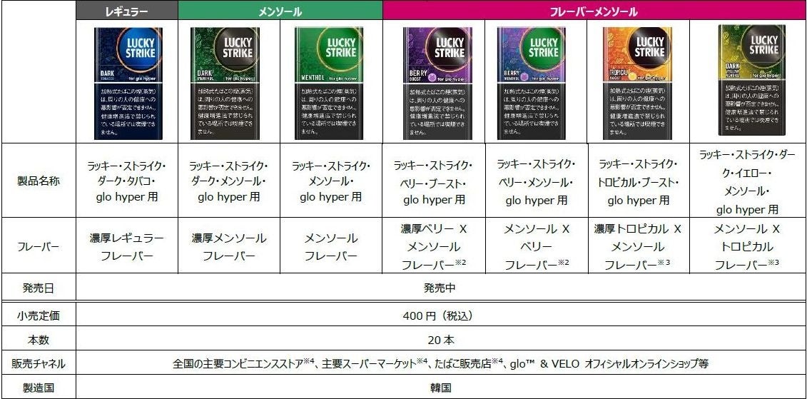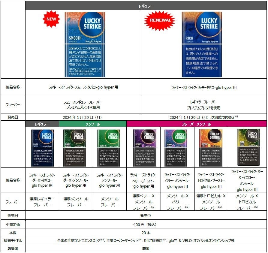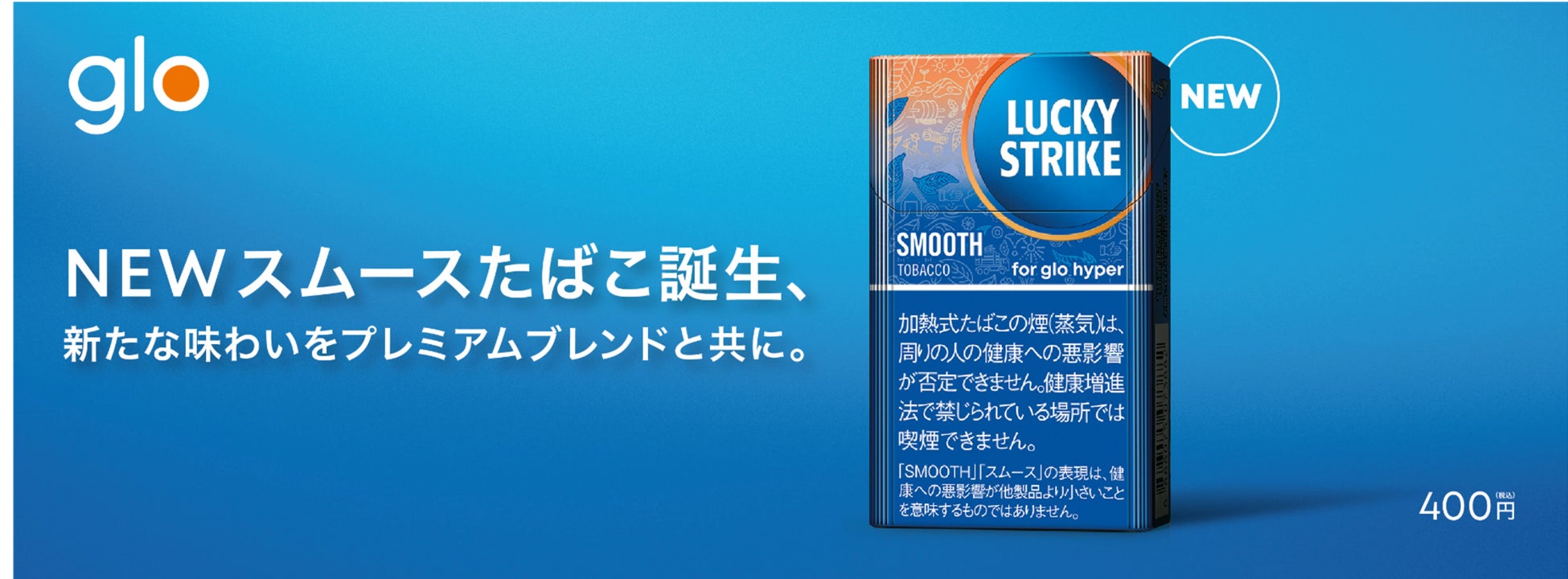 BATジャパン(本社:東京都港区、社長:エマ・ディーン、正式社名:ブリティッシュ・アメリカン・タバコ・ジャパン合同会社)は1月29日(月)より、加熱式たばこ「glo(TM)(グロー)」専用たばこスティックとして、厳選たばこ葉を使用し、妥協なき味わいを追求した新レギュラーブレンド銘柄「ラッキー・ストライク・スムース・タバコ・glo hyper用」を新発売します。また、定番レギュラー銘柄「ラッキー・ストライク・リッチ・タバコ・glo hyper用」も新ブレンドを採用して順次リニューアル(※1)します。どちらもお求めやすい400円(税込)にて、全国の主要コンビニエンスストア(※2)、主要スーパーマーケット(※2)、たばこ販売店(※2)、glo(TM) & VELO オフィシャルオンラインショップで順次展開いたします。