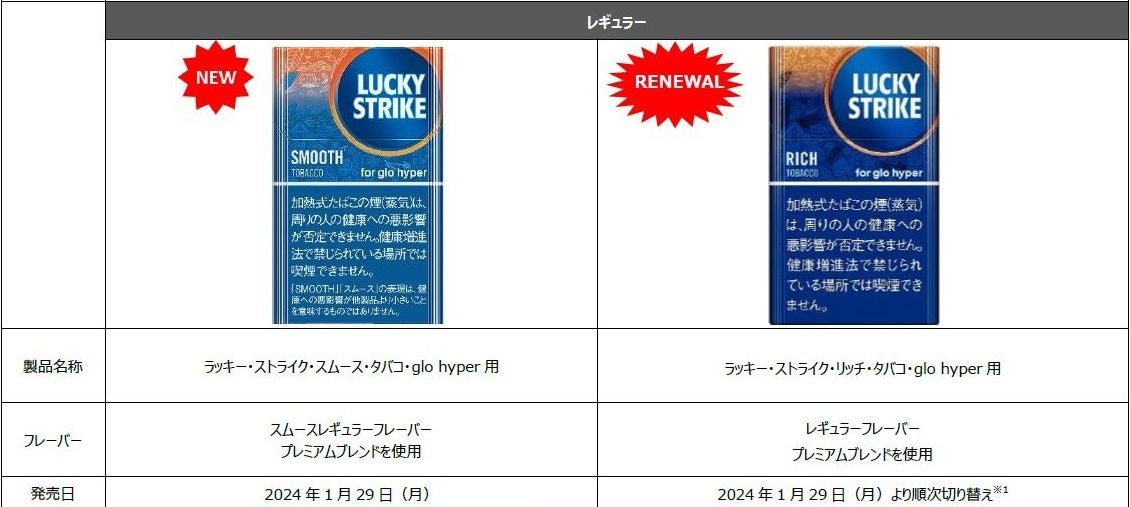 新たに登場する「ラッキー・ストライク・スムース・タバコ・glo hyper用」およびリニューアルする「ラッキー・ストライク・リッチ・タバコ・glo hyper用」は、マスターブレンダーによる厳選たばこ葉を使用した新ブレンドを採用しており、上質なレギュラーを楽しめます。太いスティックに対応している「glo(TM) hyper(グロー・ハイパー)」シリーズ専用たばこスティックとして、2023年12月より発売した最新加熱式たばこデバイス「glo(TM) hyper pro(グロー・ハイパー・プロ)」でも使用いただけます。新デバイスは新加熱技術HEATBOOST(TM)テクノロジーを搭載しており、この2銘柄との併用により深いたばこの味わいと更なる満足感(※3)を提供します。