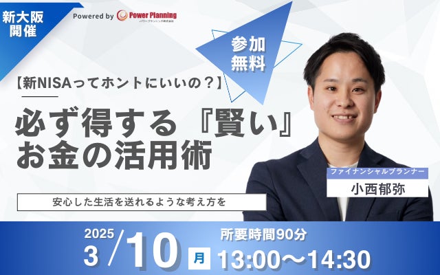 3月10日(月)13時より人気講師、小西郁弥氏による「【新NISAってホントにいいの?】必ず得する『賢い』お金の活用術」セミナーを開催いたします。