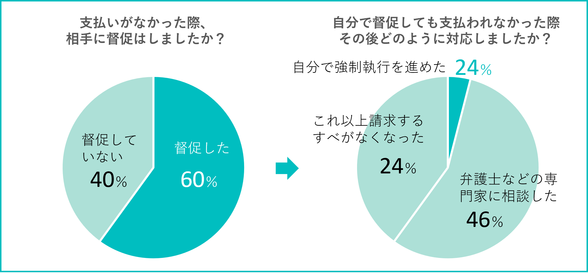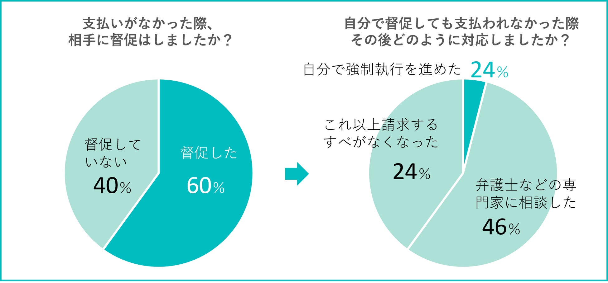 また、専門家を頼るか、諦めるかの半々となっており、自分で対応する人は少数となった。書面作成していても、自身で対応した人は少数となり、「相手の勤務先が変わり、強制執行出来なかった」など自身で強制執行するハードルの高さがうかがえます。