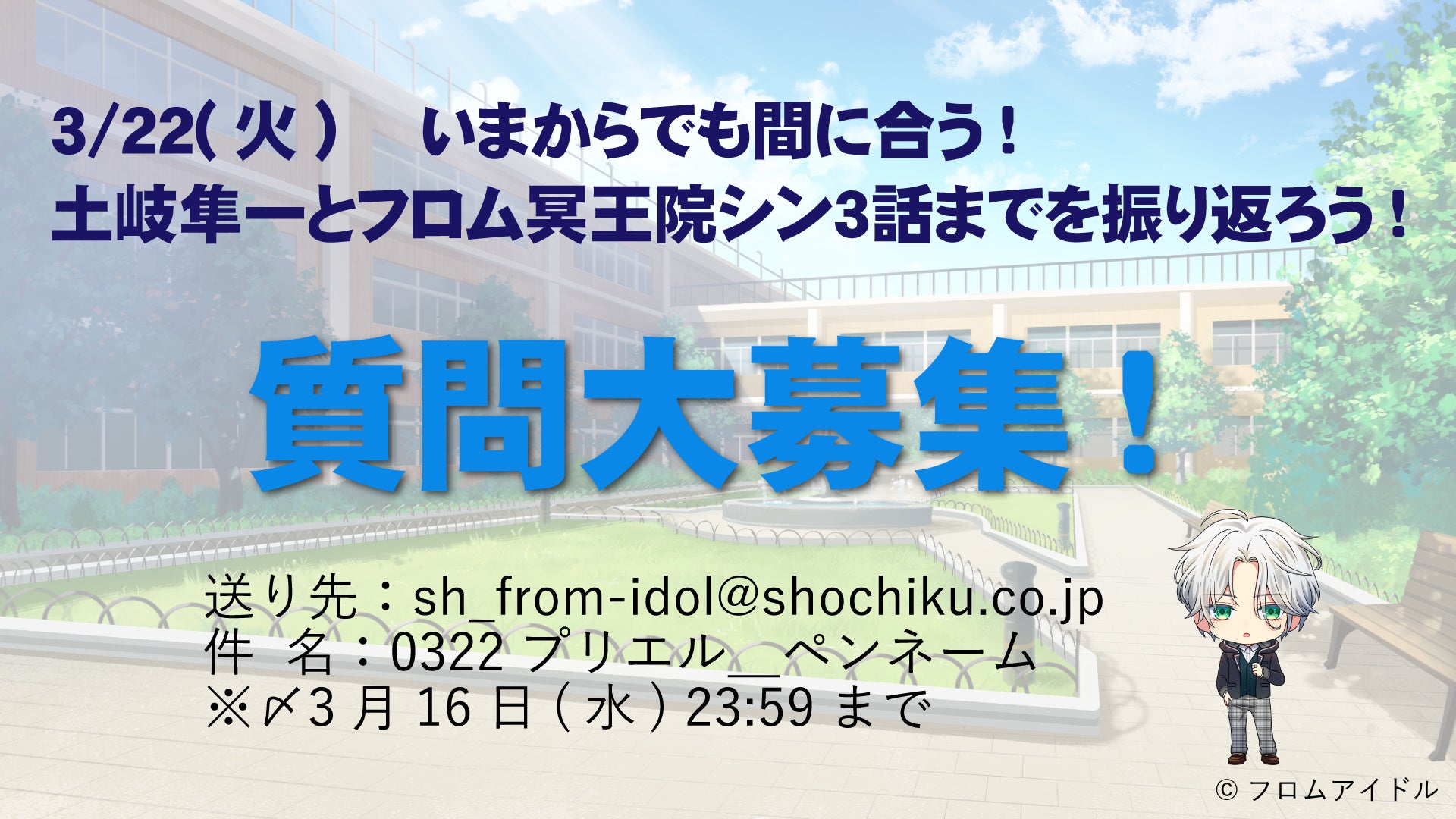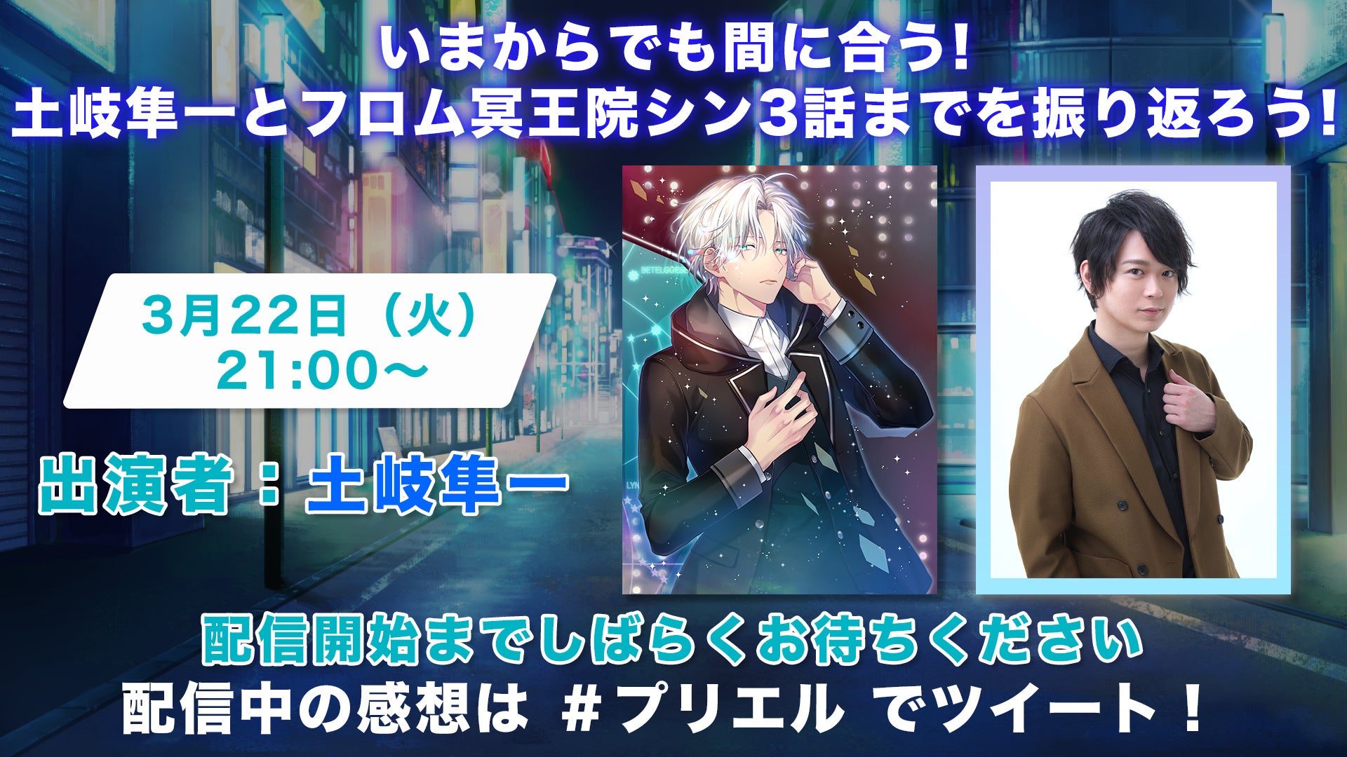 2022年3月22日(火)21時より土岐隼一をゲストに迎えて「いまからでも間に合う!土岐隼一とフロム冥王院シン3話までを振り返ろう!」を生配信でお届けすることが決定いたしました。2月22日より毎週火曜日23時に最新話が配信されているボイスドラマ『Prince Letter(s)! フロム冥王院シン』。ボイスドラマについてのトークはもちろん、この度詳細が明らかになった4月24日に開催されるイベントについての最新情報も・・・?メールにて3月16日まで質問を受け付けることも決定いたしましたので、ぜひこの機会に質問をお寄せください。皆さまからのお便りをお待ちしております。