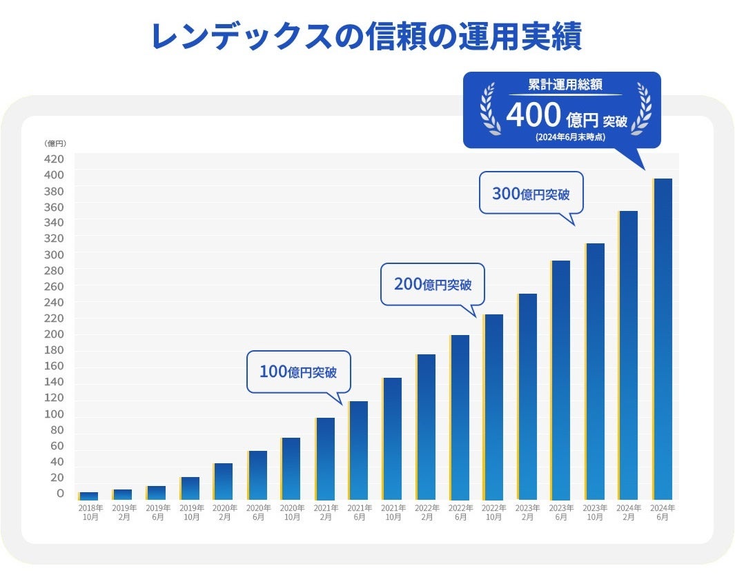 融資型クラウドファンディング「レンデックス」では、サービス開始以降2024年6月末時点で【累計運用総額 400億円】を突破いたしました。