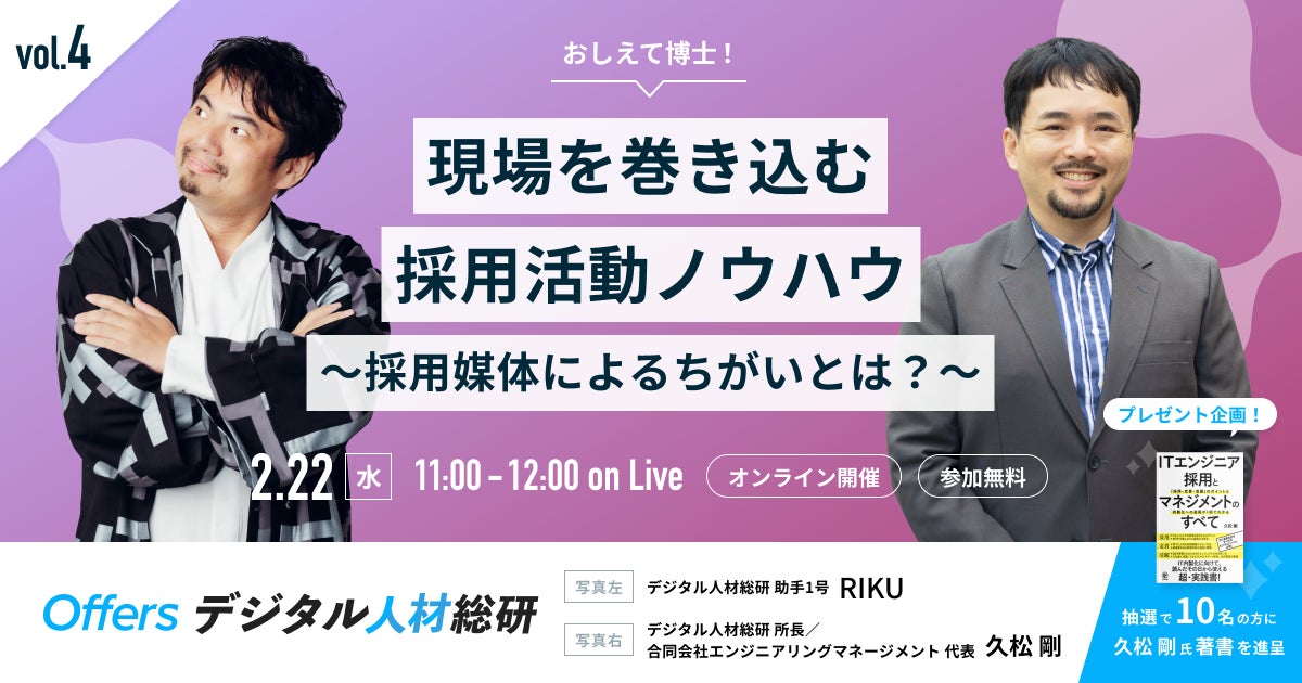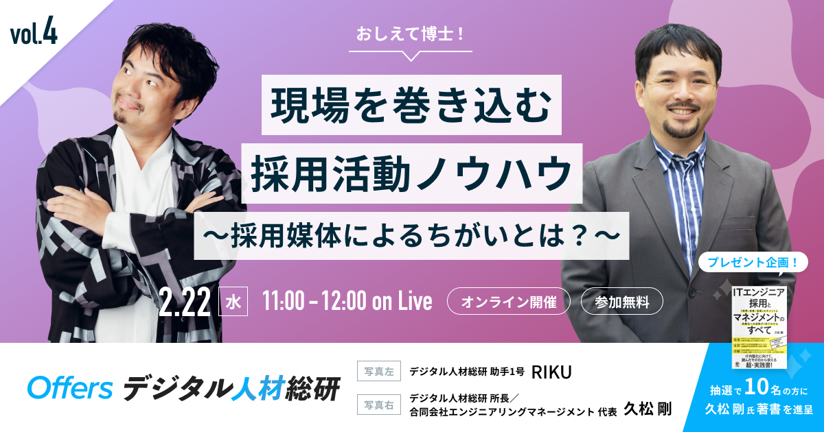| イベントタイトル | おしえて博士!Vol.4 現場を巻き込む採用活動ノウハウ~採用媒体によるちがいとは?~ |