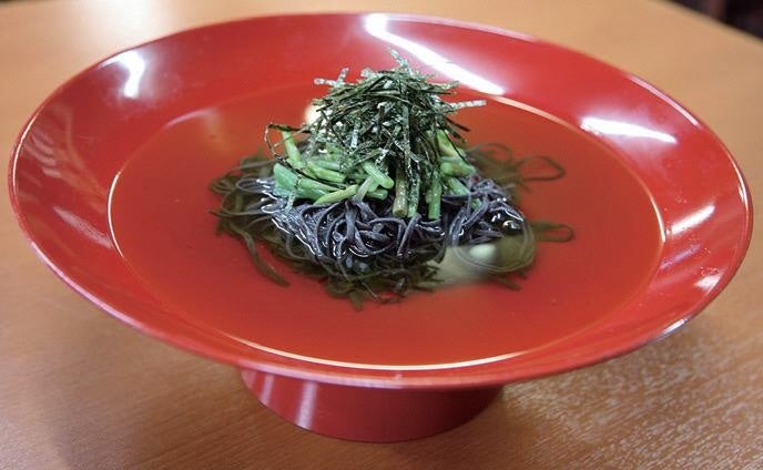 食堂大江山で提供される赤い盃に黒いそばの「鬼そば」は大江山の名物。しっかりとした喉ごしと山菜たっぷりのそばが特徴的です。赤い盃を持つ様は、まるで「最強の鬼」酒吞童子のよう。福知山市では他にも個性豊かな「鬼そば」が食べられます。