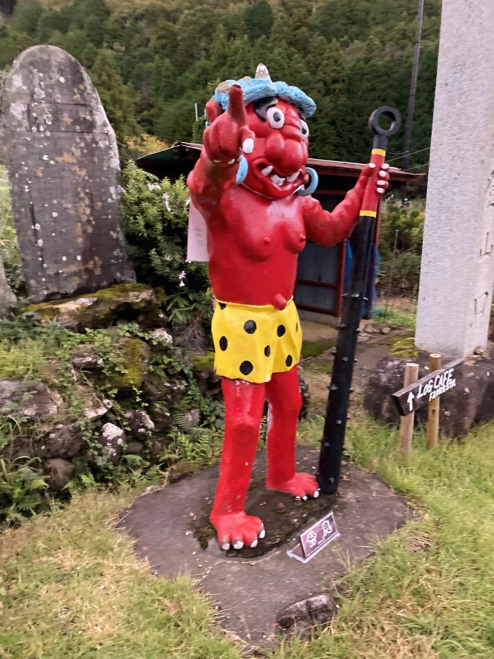大江山に向かう道の途中に立つ、愛嬌たっぷりの鬼の像。山のあちこちに、全13体の鬼たちが鎮座しています。