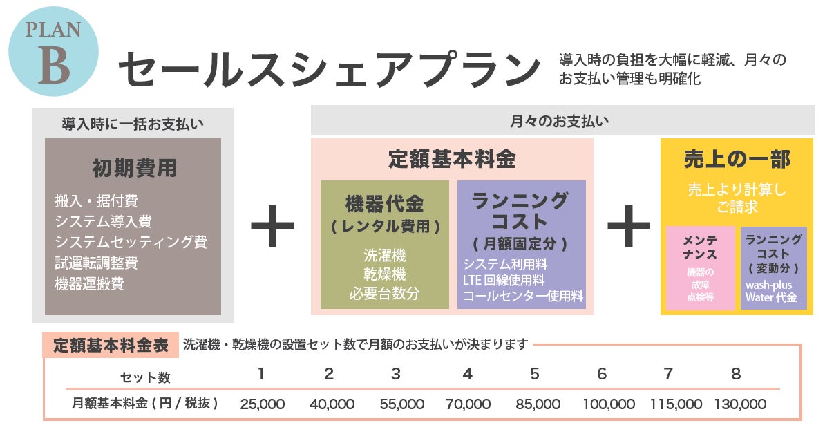 株式会社wash-plus(本社:千葉県浦安市、代表取締役:⾼梨健太郎)が、好評販売中の宿泊施設向けランドリー「wash+ Comfort」について、導⼊費⽤を抑えた新プラン「セールスシェアプラン」を発表、10⽉1 ⽇より提供を開始しました。