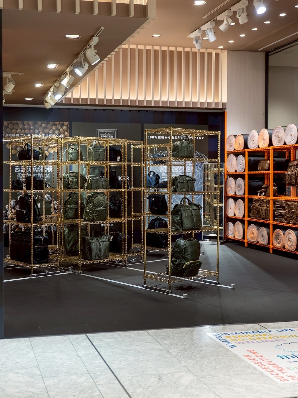 TANKER生地がバッグになる前のロールを並べた壁や、