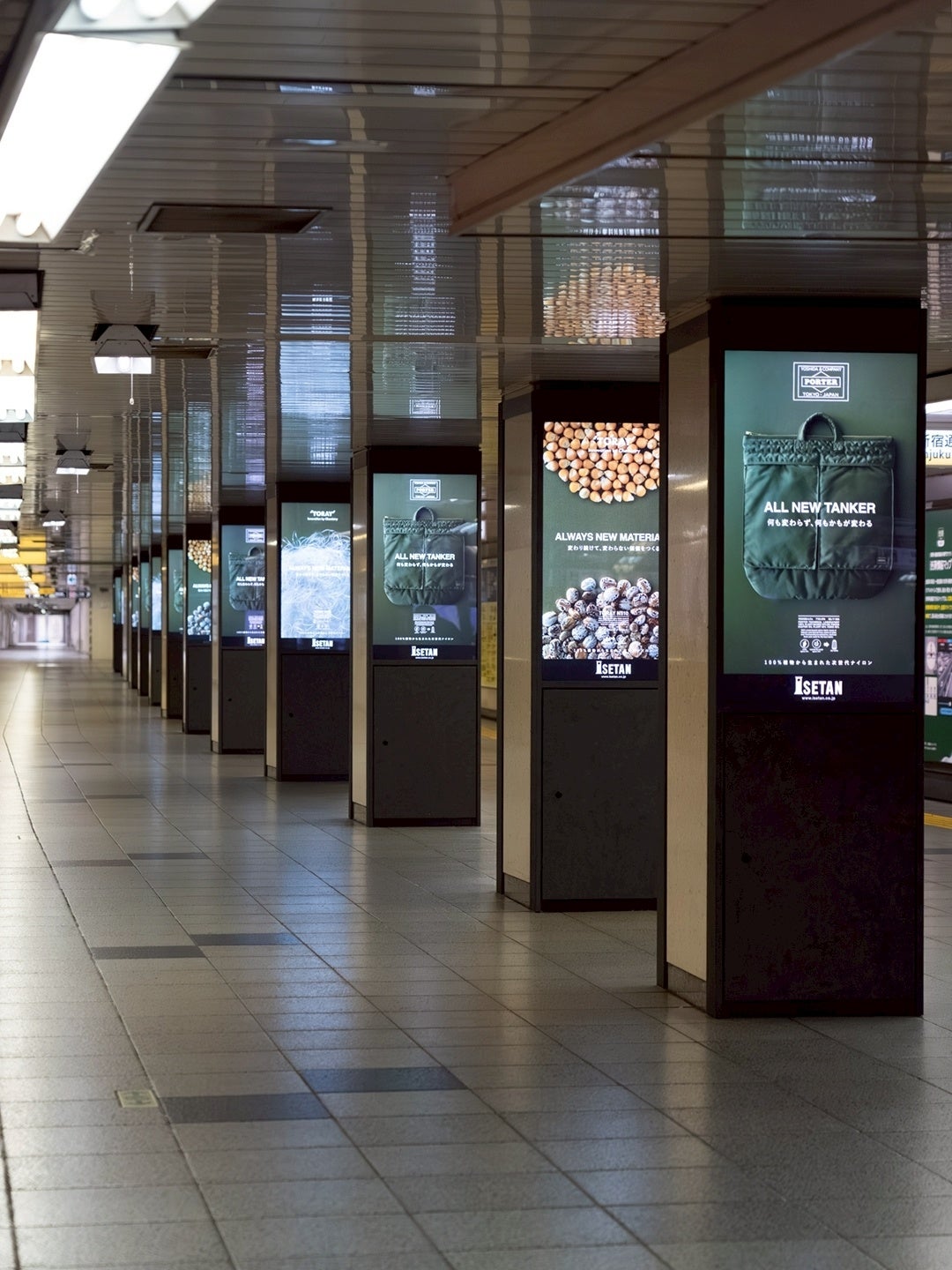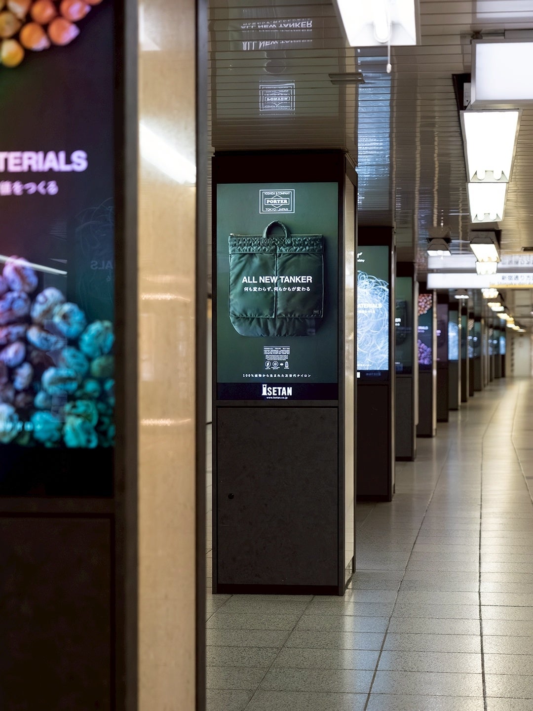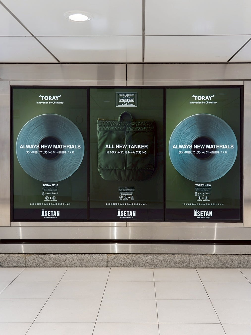 新宿三丁目駅や伊勢丹新宿店には、世界ではじめて量産化に成功した「100%植物から生まれた次世代ナイロン」の広告が掲出されています。