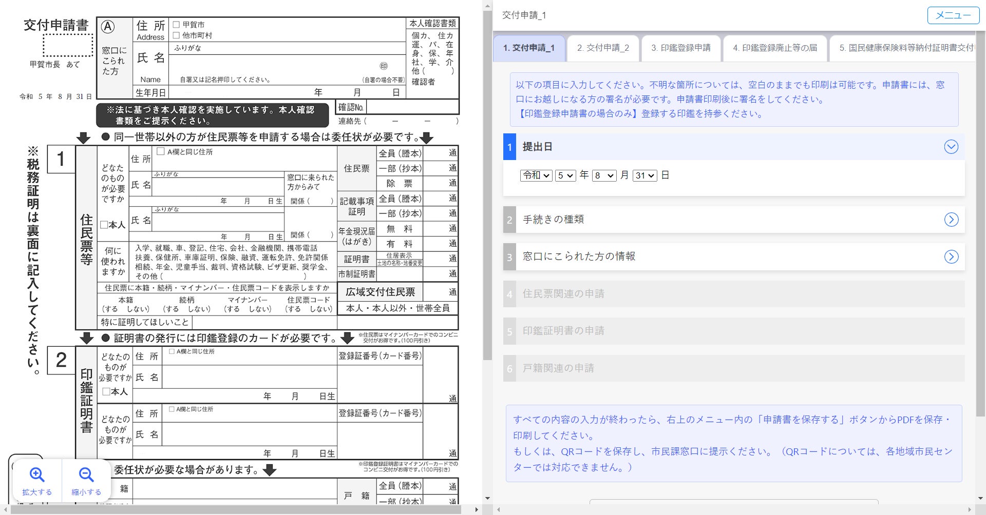 今回新たに導入されるサービスは、証明書の発行に関する4つの申請書を、Webブラウザ上で作成できるようにするものです。市民がお使いのパソコンやタブレット端末、スマートフォンのWebブラウザ上で申請書作成フォームを表示し、フォームの設問に回答することで、入力した情報が書き込まれた申請書のPDFファイルまたは復元用二次元コードのPDFファイルで作成・保存します。