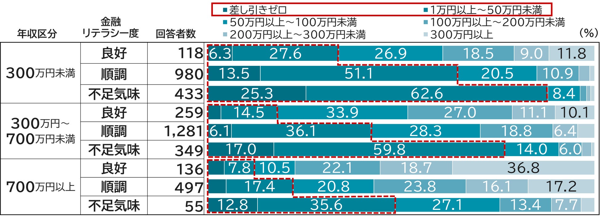 続いて、「年間の資産形成額」と「金融リテラシー度」について分析してみると、年収区分に関係なく資産形成額が「差し引きゼロ」「1万円以上~50万円未満」と回答した人の割合は、「金融リテラシー度」が高くなるにつれて減少していることがわかりました。結果として「金融リテラシー度」が高い人の方が、年間の資産形成額も多くなっている傾向が見られました【図表4】。