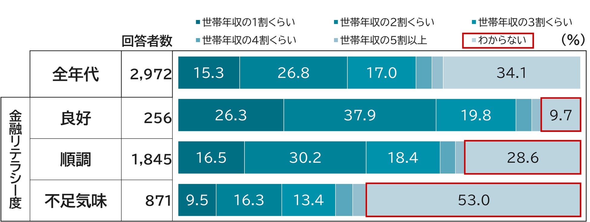 住まいの選択に関連して、「年収に占める住宅ローン返済割合」を住宅ローン利用中(または過去に利用経験あり)の方に伺ってみたところ、「わからない」と回答している人の割合に特徴がみられました。「金融リテラシー度」が高くなるにつれて返済割合が「わからない」と回答した人の割合が大きく減少しており、「金融リテラシー度」が高い人ほど、自身の住宅ローンの返済内容をきちんと認識している傾向がみられました【図表6】。