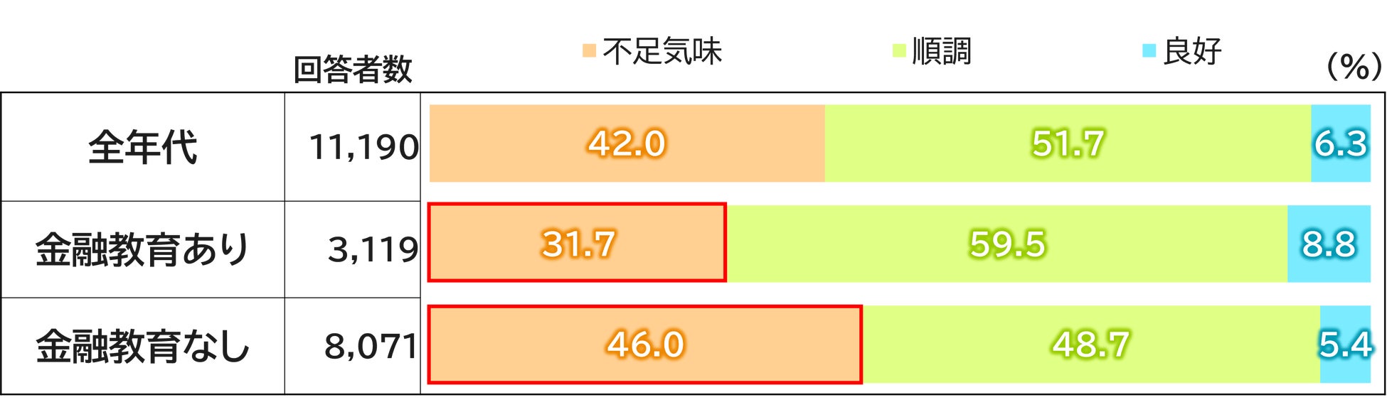 スコア化した「金融リテラシー度」を各属性設問とクロス集計することで、「金融リテラシー度」が高い人の特徴を分析しました。まずは金融教育経験と「金融リテラシー度」についてですが、「金融教育あり」と回答した人は、「金融教育なし」と回答した人よりも「金融リテラシー度:不足気味」の割合が14.3%少ない結果となり、全体的に金融教育経験がある人はない人に比べて「金融リテラシー度」が高い傾向となりました【図表2】。