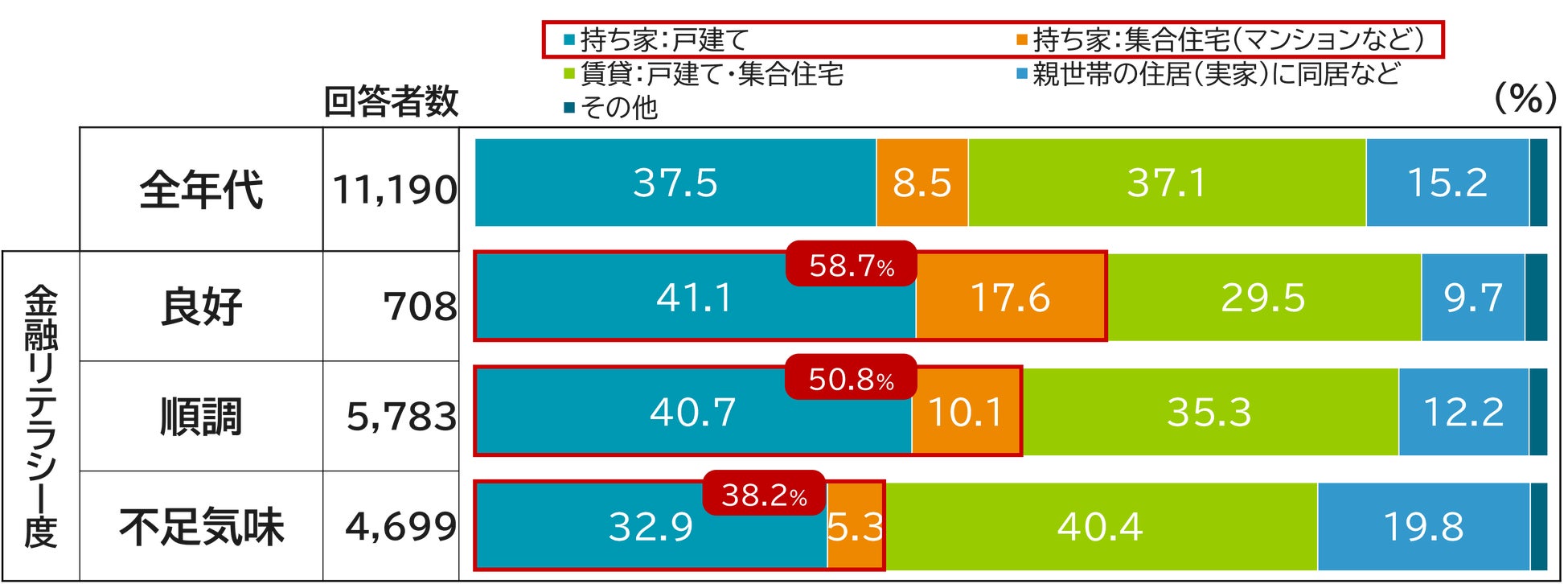 続いて、回答者の「住まいの選択」と「金融リテラシー度」を分析してみたところ、住まいを「持ち家」と回答している人の割合は「金融リテラシー度」が「良好:58.7%」、「順調:50.8%」、「不足気味:38.2%」となり、結果として「金融リテラシー度」が高い人ほど、持ち家を選択する人の割合が増加している傾向がみられました【図表5】。