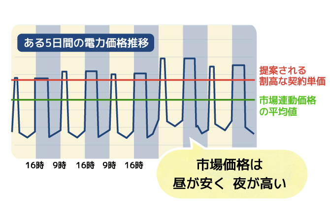 30分ごとの取引価格に連動するので、日中の電力料金の低下の恩恵も期待いただけます。主な電力使用時間帯が日中である法人様であれば、特に効率的に電力利用が可能です。