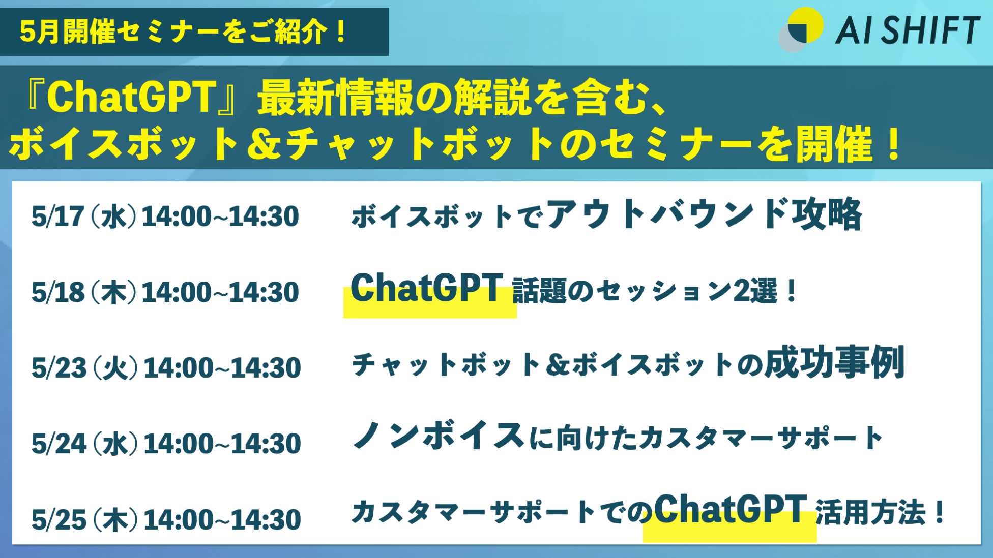 日時 | ①【営業架電や予約確認電話も自動化!】アウトバウンドにおけるボイスボットの活用方法 5月17日(水) 14:00~14:30 ②【ChatGPTセッション2選!】ChatGPTと従来のAIチャットボットの違いは?ボイスボットにおけるChatGPTの利用方法とは? 5月18日(木) 14:00~14:30 ③【パートナー企業様必見!】チャットボット/ボイスボットを用いたカスタマーサポートDXの成功例 5月23日(火) 14:00~14:30 ④【ノンボイス化】企業毎の理想のカスタマーサポートとは? 5月24日(水) 14:00~14:30 ⑤【大好評!】カスタマーサポートにおけるChatGPTの活用方法を解説! 5月25日(木) 14:00~14:30 |